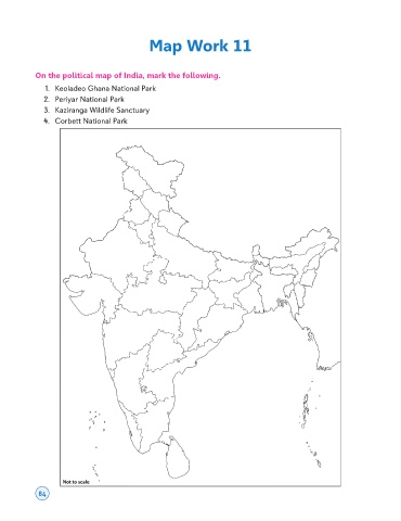 Map Work 11 On the political map of India, mark the following. 1. Keoladeo Ghana National Park 2. Periyar National Park 3. Kaziranga Wildlife Sanctuary 4. Corbett National Park 84